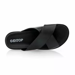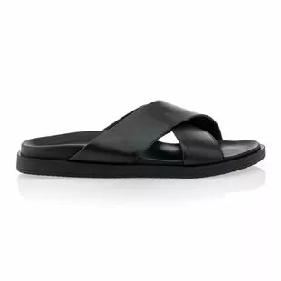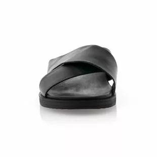 Ces mules en cuir noir se composent d’une semelle moelleuse extrêmement confortable et de deux larges brides croisées sur le dessus du pied. Leur style moderne et épuré pourra venir finaliser des tenues variées. Un pantalon chino retroussé aux chevilles et un tee-shirt à col tunisien par exemple ?