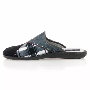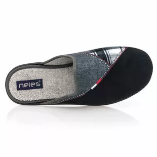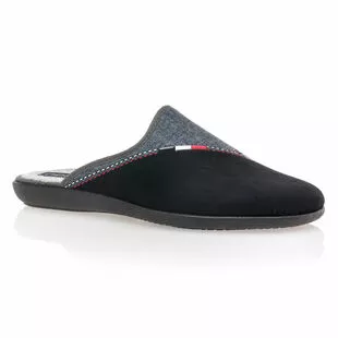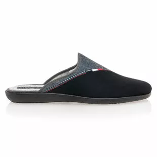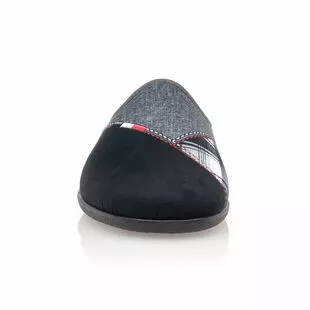 La nuance noire de ces pantoufles mules pour homme est contrastée dans un esprit graphique et moderne par une toile en denim bleu et par des surpiqûres blanches et rouges. On adopte sans aucune hésitation ce modèle homewear masculin ultra confortable et résistant dans la durée !