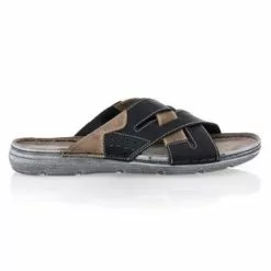 On adopte un chaussant confortable et décontracté grâce à cette paire de mules en cuir gris et beige. Ce modèle pour homme aux deux larges brides croisées sur le dessus du pied pourrait par exemple accompagner un bermuda et un polo de couleur claire.